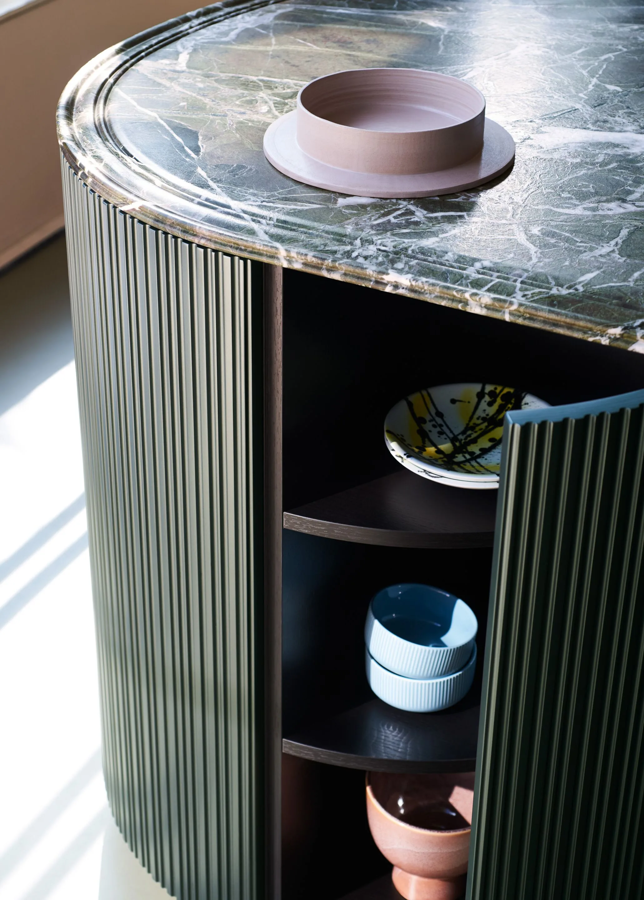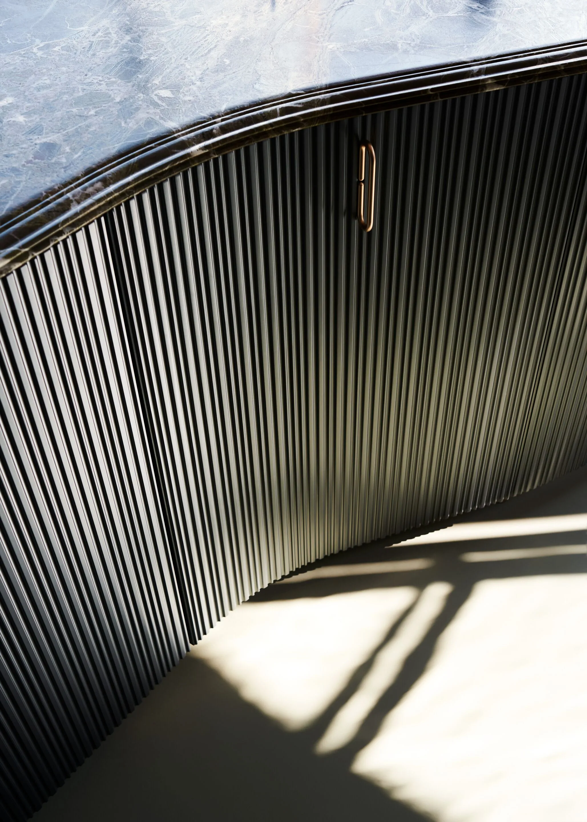 To accentuate Tangram’s fluidity, the cabinet door features a special decorative detail upon request: a three-dimensional element called Groove, made up of a sequence of vertical incisions which create an irregular pattern, designed to hide the joint between modules and ensure a unitary perception of the arrangement.