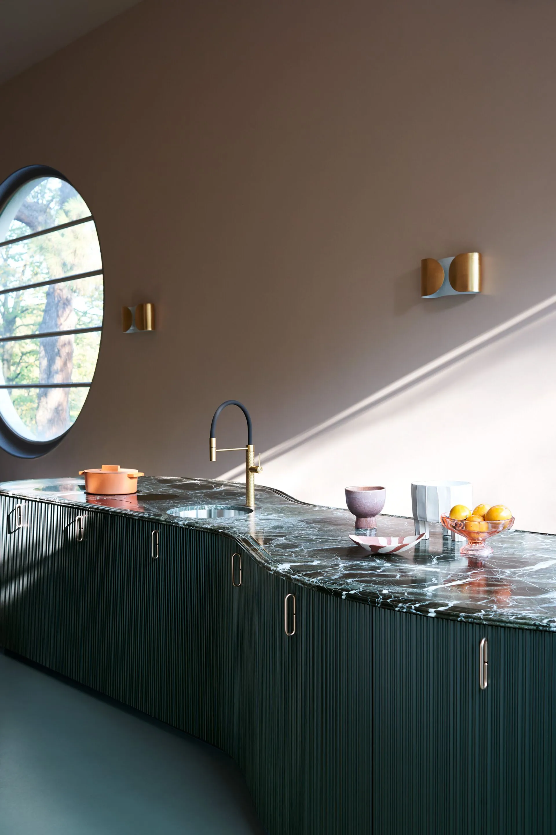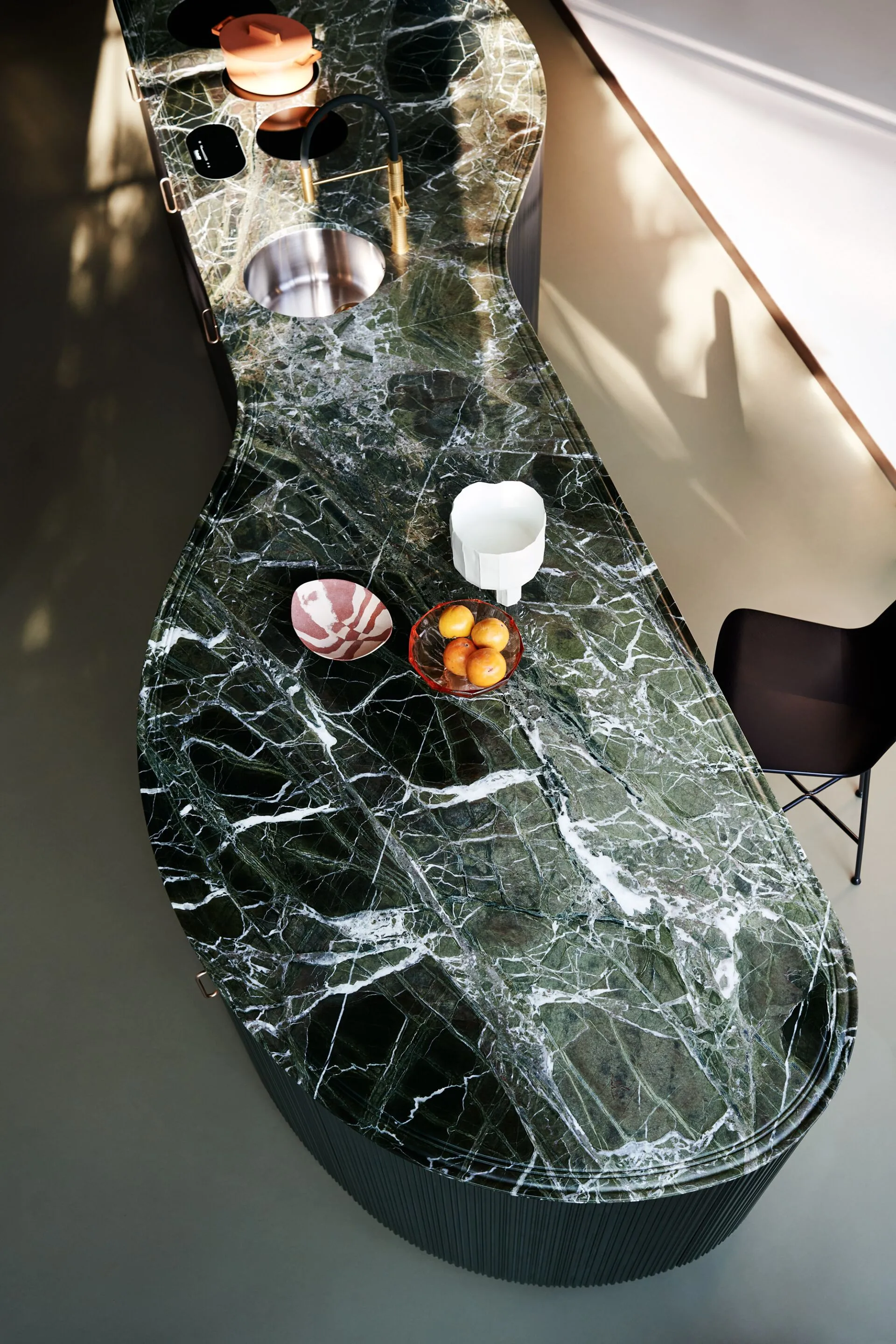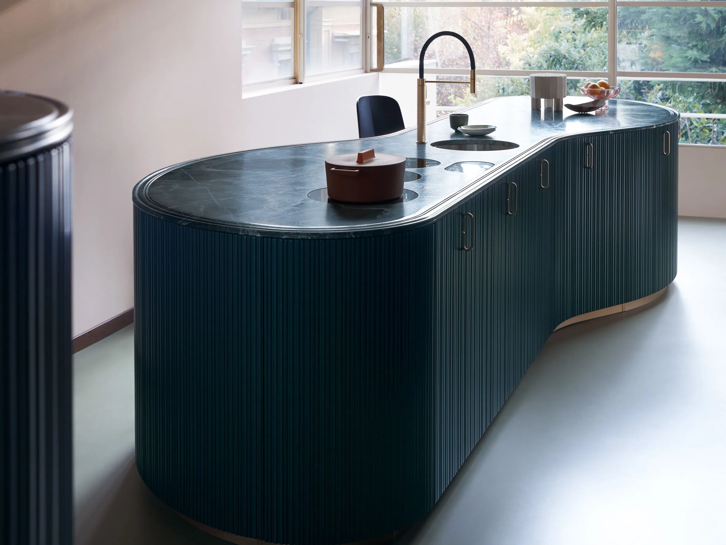 Tangram is made up five curved elements that can be combined with straight elements at will, to build kitchen islands with unusual shapes, compositions set against the wall, or even solutions that wrap around corners.