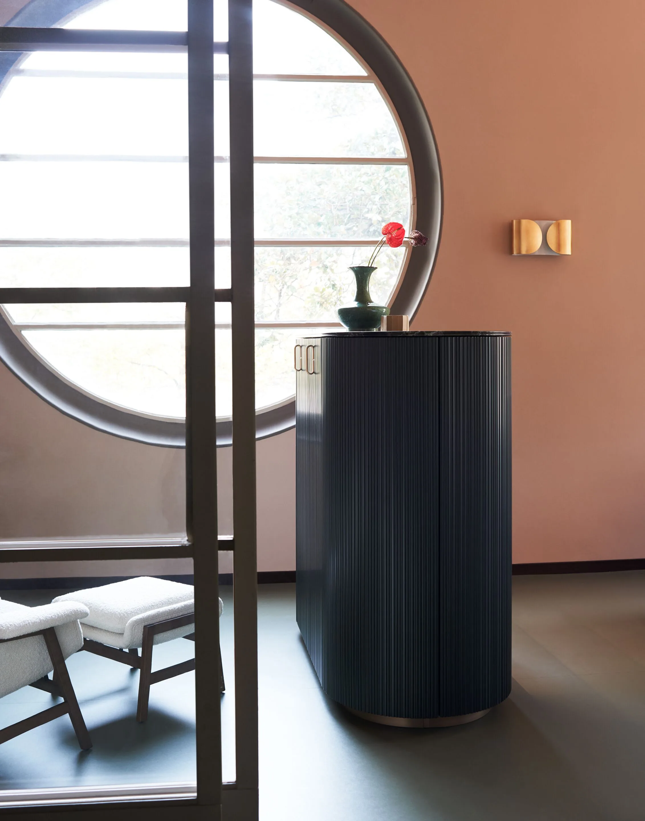 To accentuate Tangram’s fluidity, the cabinet door features a special decorative detail upon request: a three-dimensional element called Groove, made up of a sequence of vertical incisions which create an irregular pattern, designed to hide the joint between modules and ensure a unitary perception of the arrangement.
