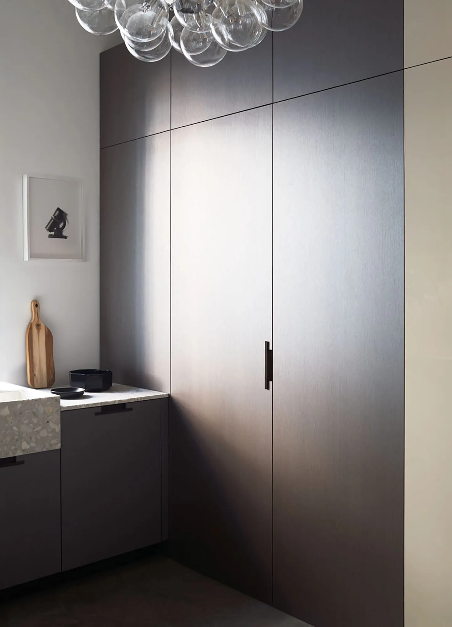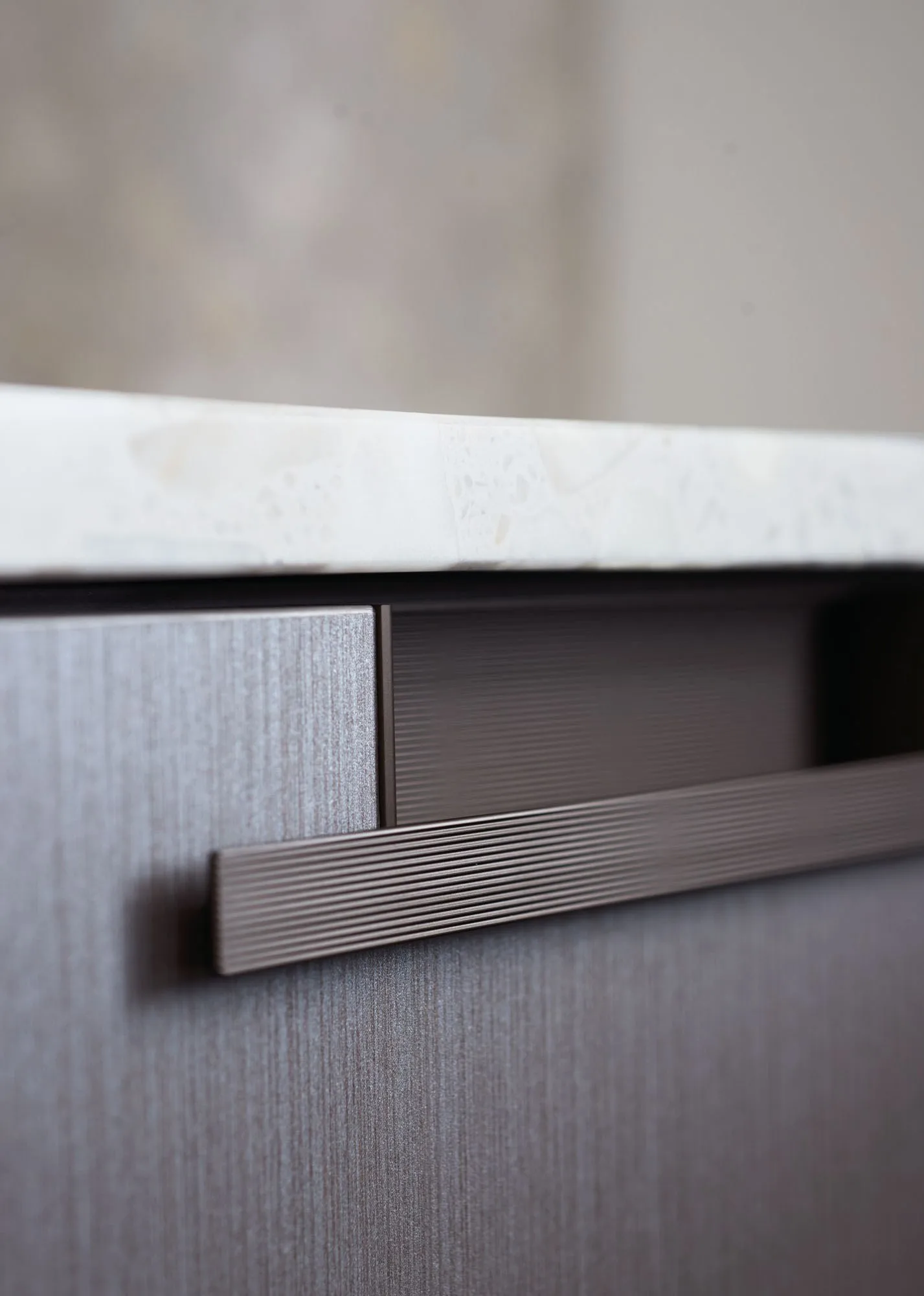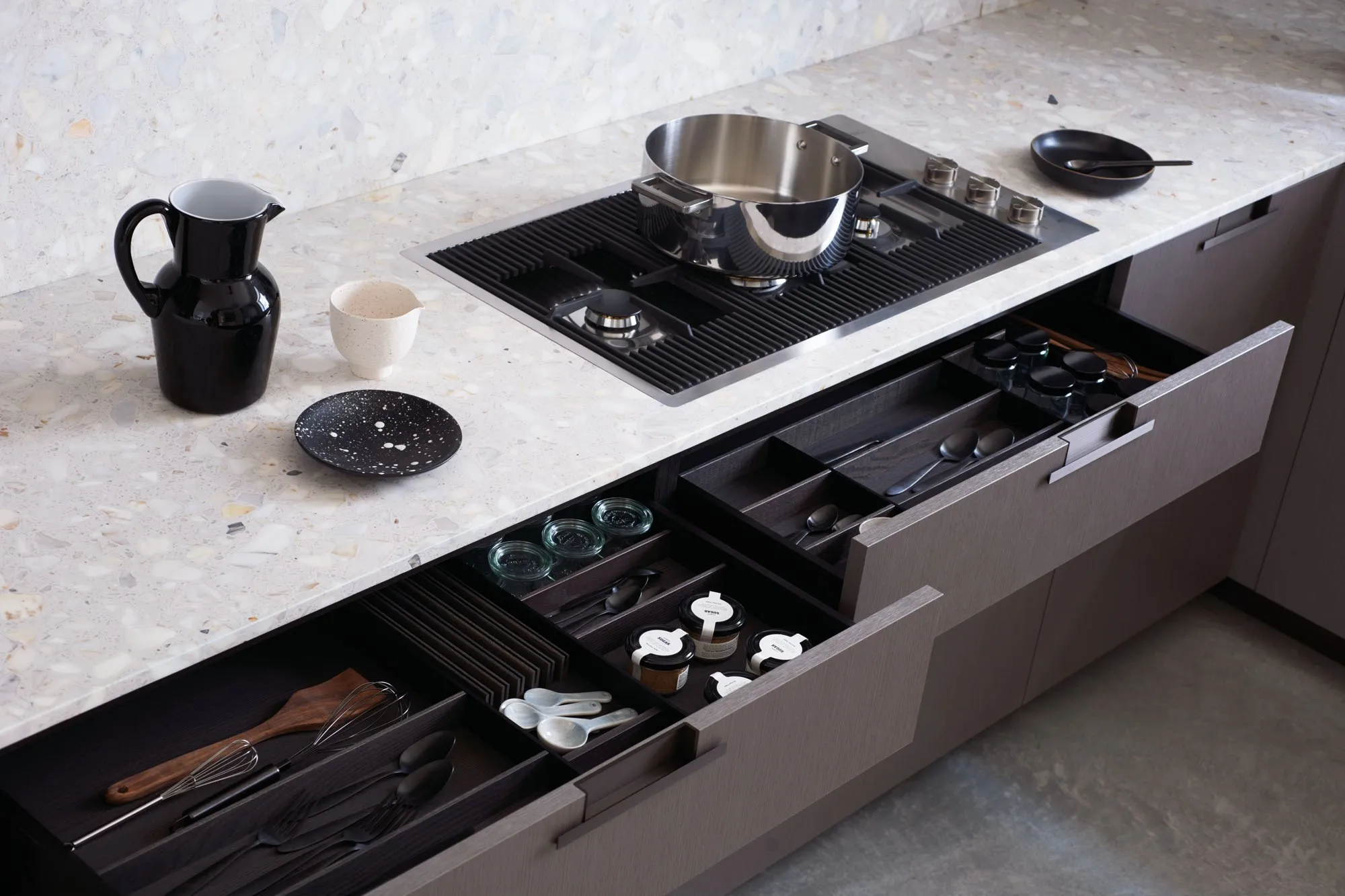 Bases and cabinets: doors in Lutezio melamine, bronze Ouverture handles, and worktop in Bianco Apuano engineered stone. Trilli wall units, hood, and open compartments in Rovere Termocotto.