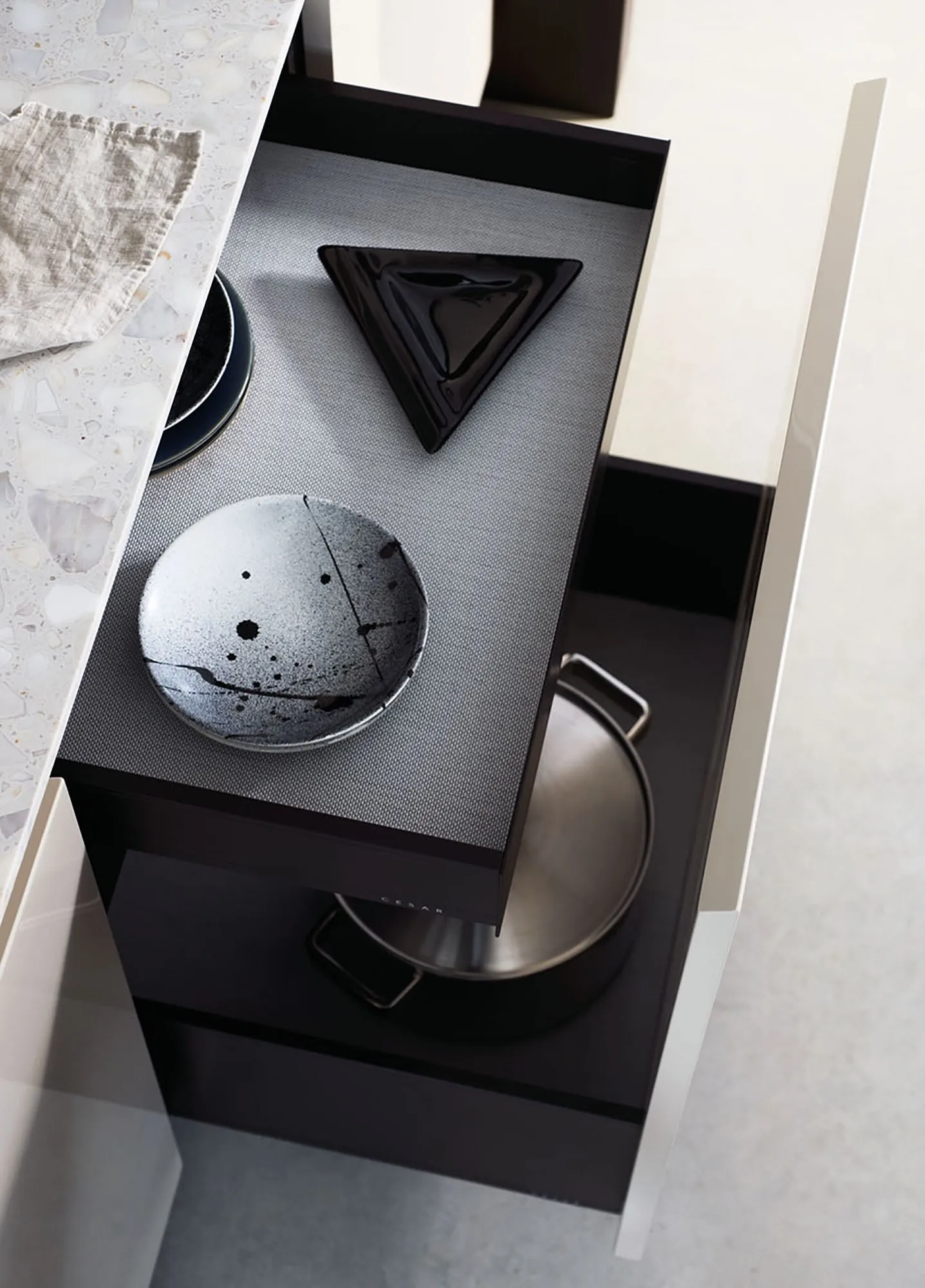 Lutezio melamine, Bianco Apuano engineered stone, Rovere Termocotto wood, Magnolia glossy lacquered.