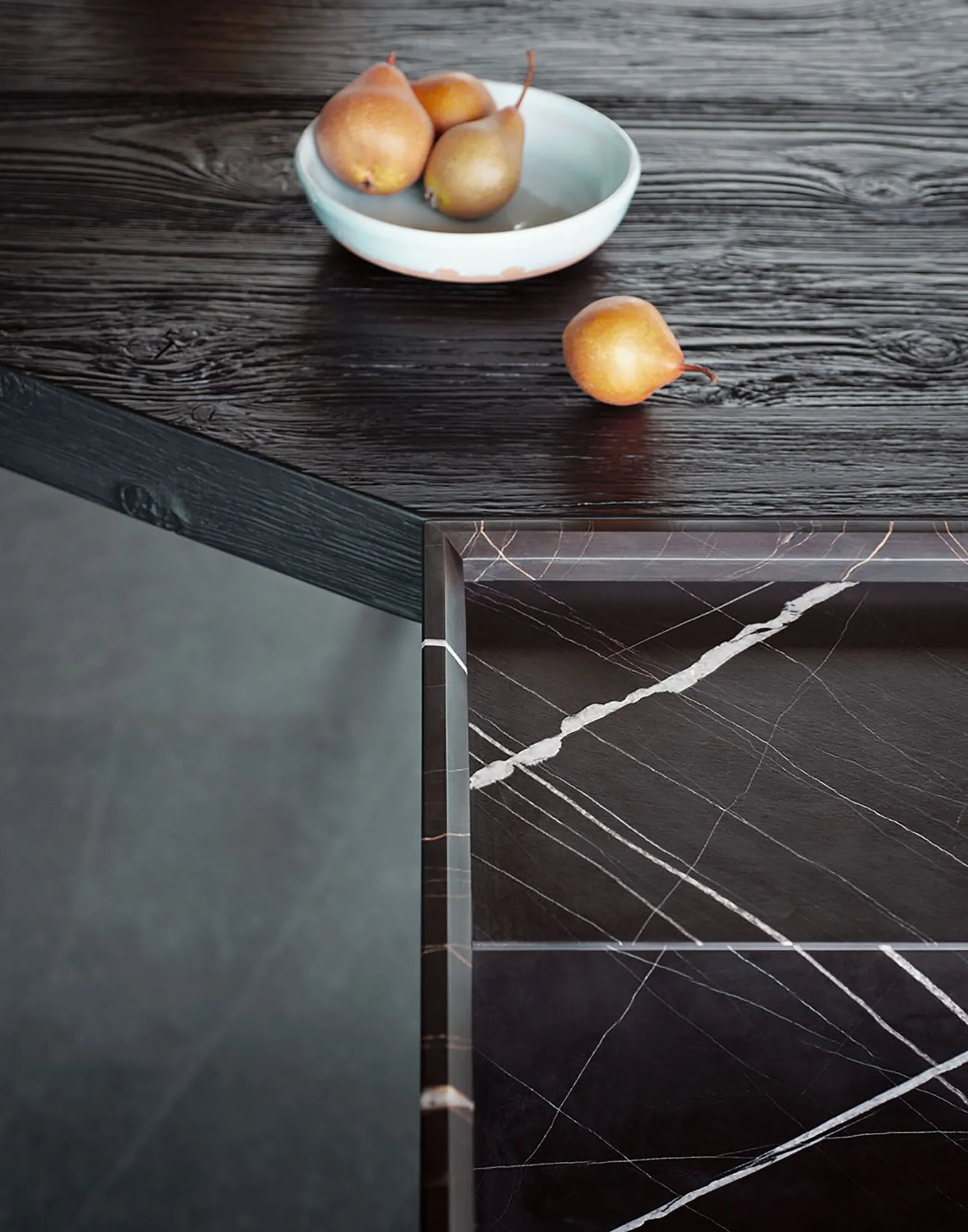 Nero Portoro engineered stone, Ferro Anodyc metallic-look lacquered, Tabià Nero antique-effect wood, Sahara Noir marble