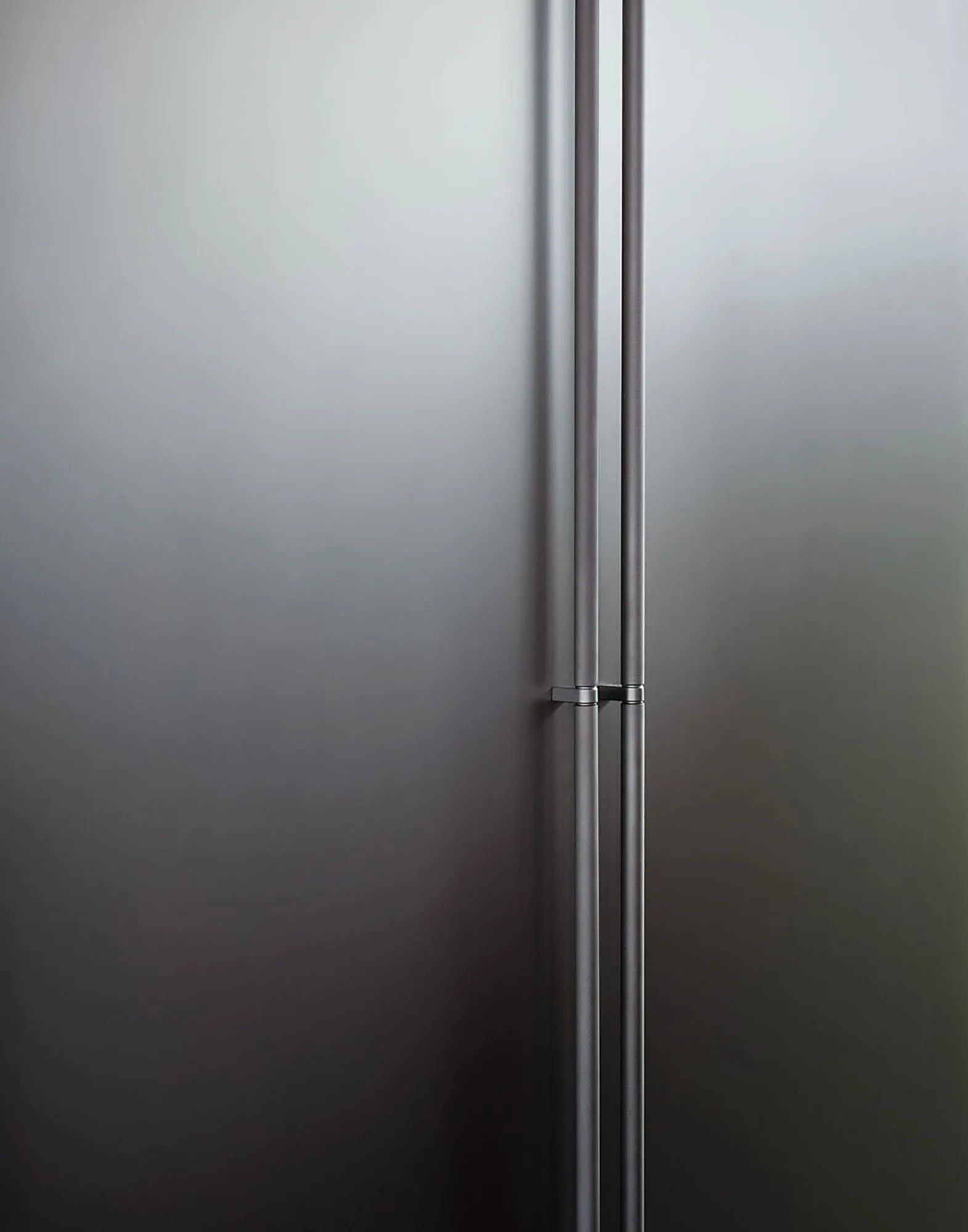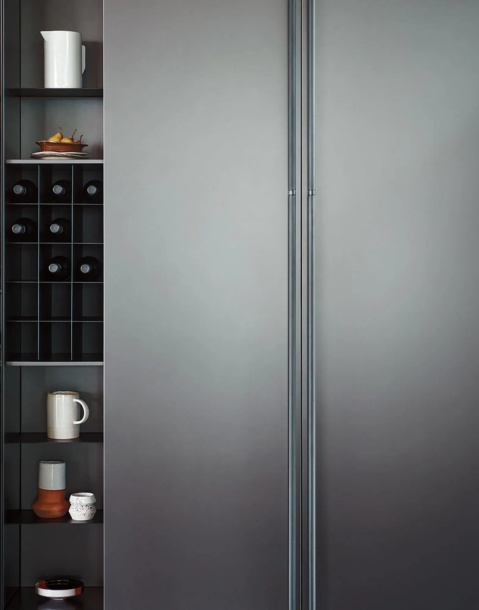 Tall units: Ferro Anodyc metallic-look lacquered doors. Display tall units with internal Comb organisation and Thin open units.