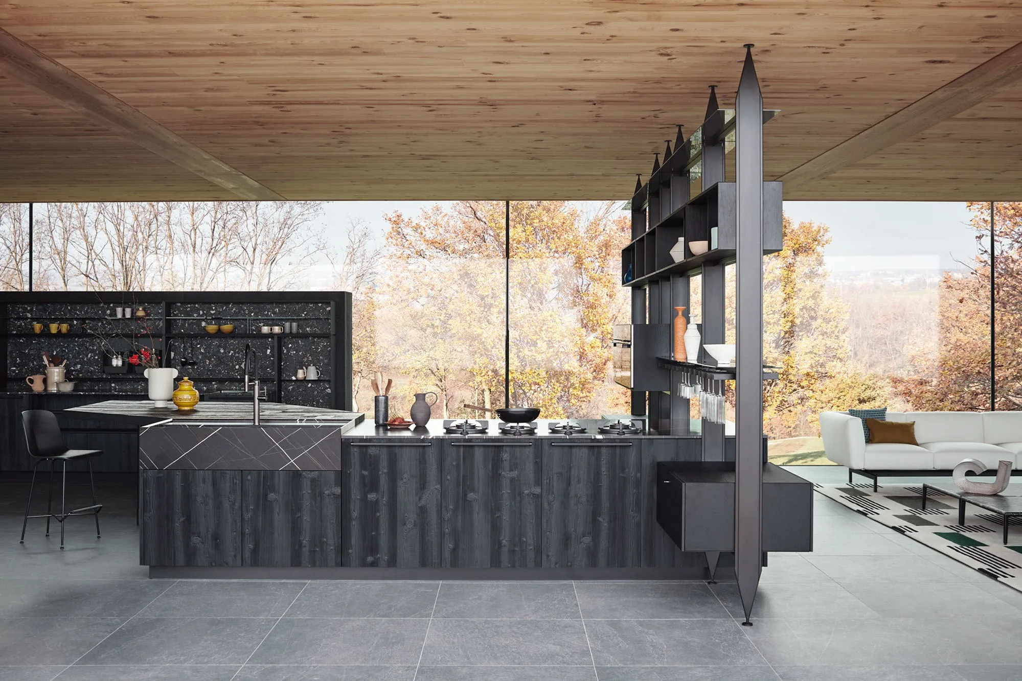 Island and snack surface: Tabià Nero antique effect wood doors, black knurled Pipe handle, Sahara Noir marble worktop. Emerald snack in Tabià Nero antique effect wood with Flamingo black structure.