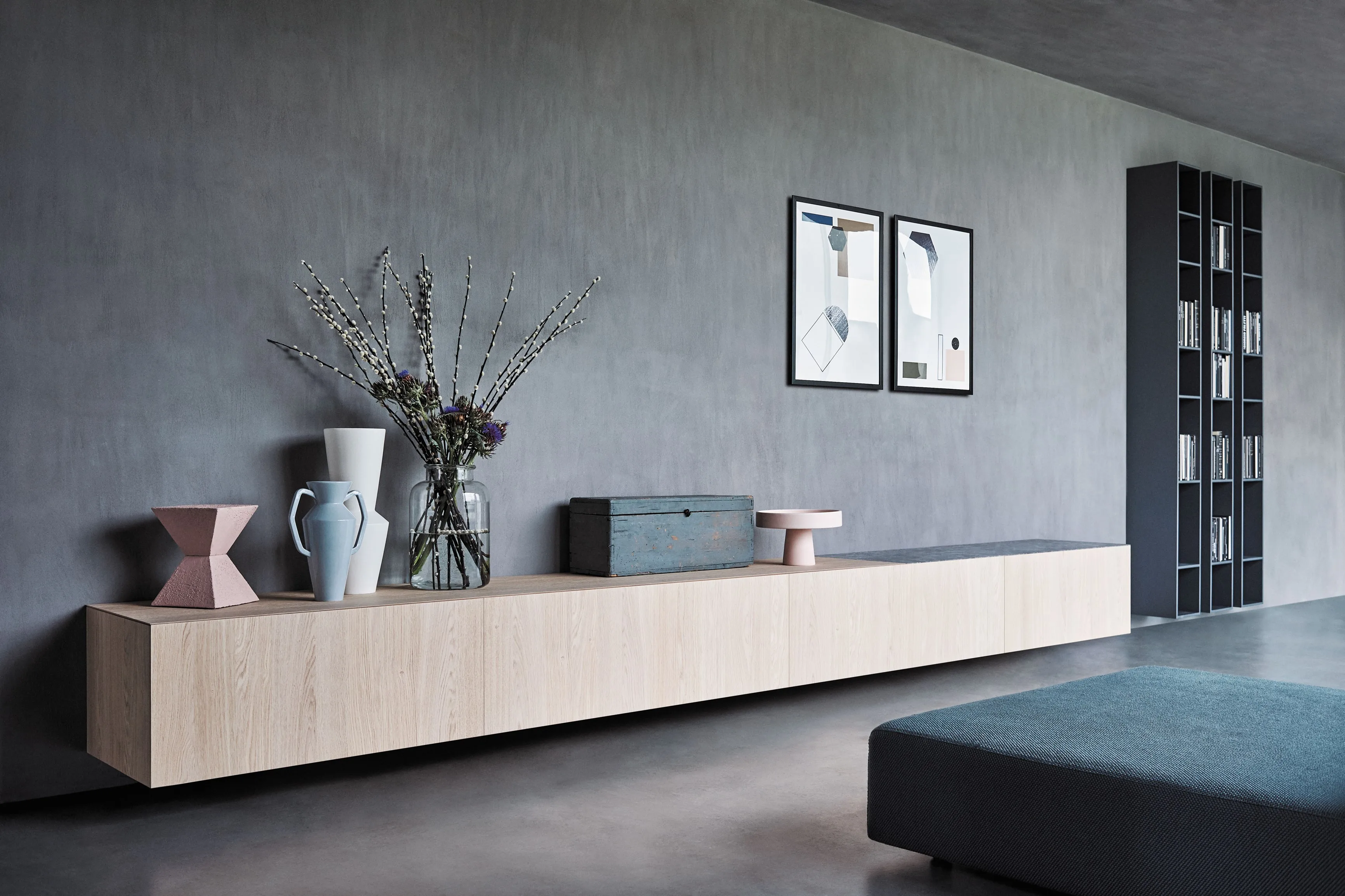 Trilli open shelving units: in Plumbeo structured lacquer